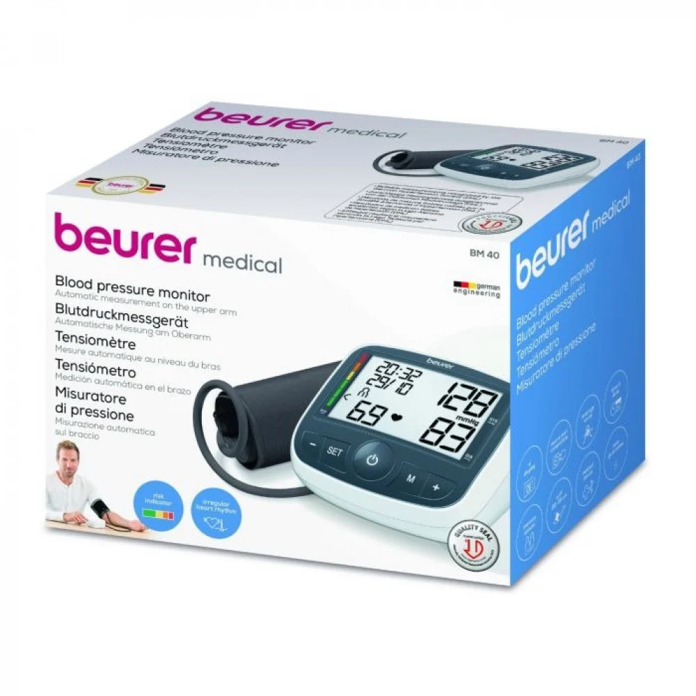 جهاز قياس ضغط الدم من أعلى الذراع BM 40 من بيورير هو جهاز مراقبة ضغط دم آمن وبسيط ، بينما تعرض شاشة العرض الكبيرة جدا نظرة عامة على قيم قياس ضغط الدم ومعدل النبض. مع تصميم مضغوط وشاشة واضحة للسماح لك بمراقبة ضغط الدم لديك على النحو الأمثل. LCD كبيرة ، قياس ضغط الدم التلقائي بالكامل وقياس النبض على اعلى الذراع ، متوسط جميع القيم المحفوظة ، متوسط ضغط الدم في الصباح والمساء لآخر 7 أيام ، مساحات ذاكرة 2 × 60 ، مؤشر خطر ، اكتشاف عدم انتظام ضربات القلب ، لمحيط الذراع العلوي من 22 إلى 35 سم ، التاريخ والوقت / إيقاف التشغيل التلقائي ، رسالة الاستخدام غير الصحيحة ، حقيبة التخزين.