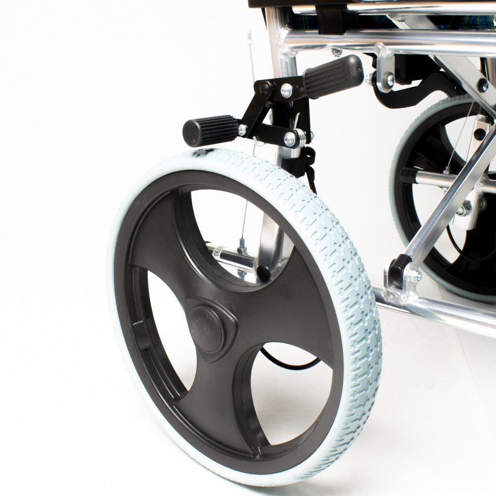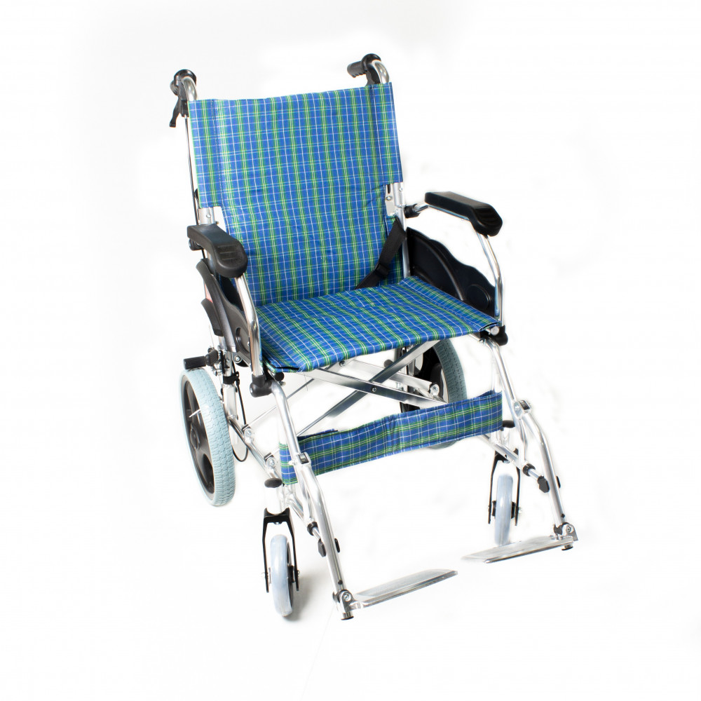 كرسي متحرك المونيوم خفيف الوزن مقاس ١٨انش كفر صغير كاروهات ازرق قابلية طي الظهر موديل 863